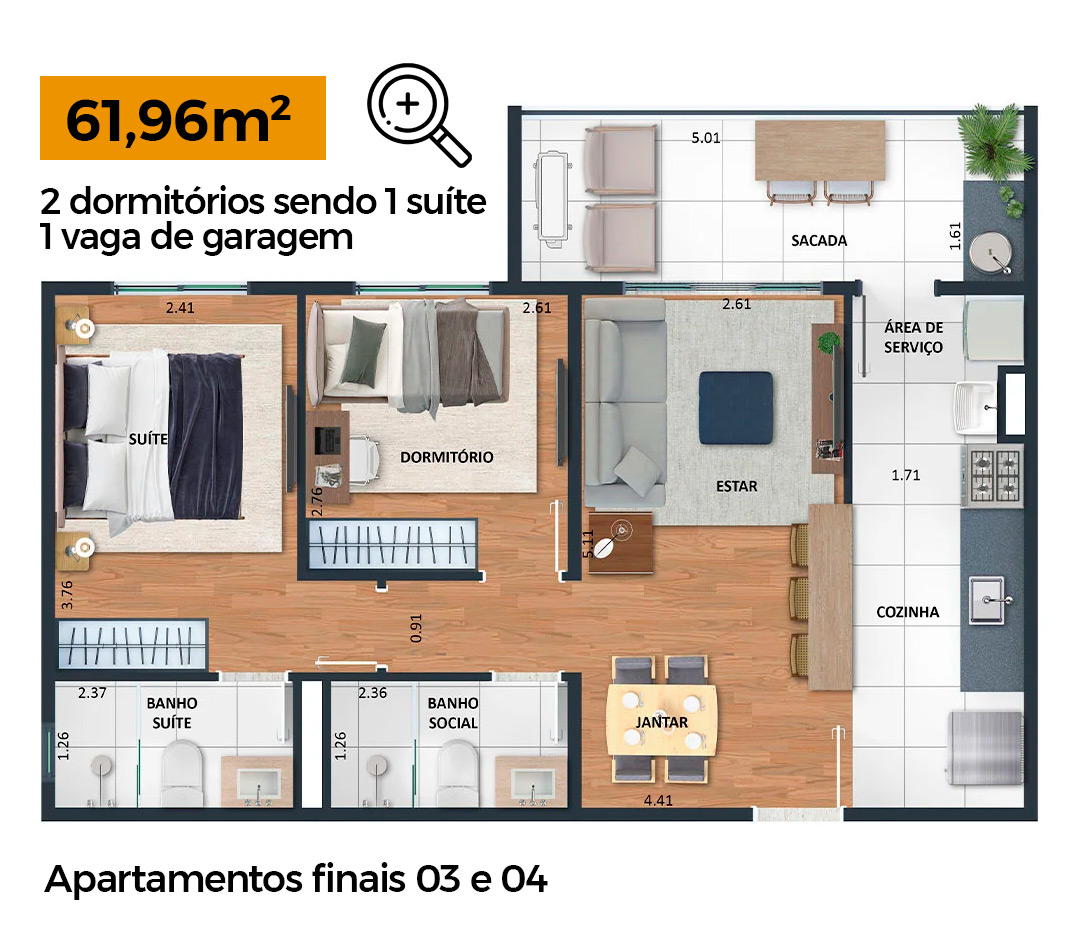 As áreas comuns do condomínio caraíva contam com: academia (fitness), salão de festas, churrasqueria, playground, pet place, jardim, mini mercado e lavanderia. A área de lazer será entregue mobiliada e equipada conforme o memorial descritivo.
